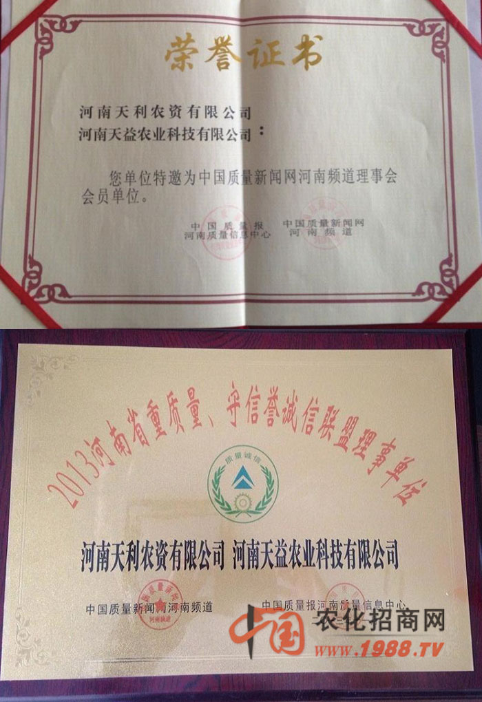 河南天利農(nóng)資有限公司為更好拓展市場(chǎng)和適應(yīng)市場(chǎng)發(fā)展趨勢(shì),2013年9月注冊(cè)分公司“河南天益農(nóng)業(yè)科技有限公司”注冊(cè)資金為2000萬(wàn)元,涉及行業(yè):農(nóng)業(yè)技術(shù)服務(wù)、開發(fā);化肥;種子;貨物進(jìn)出口業(yè)務(wù)。不僅讓更多農(nóng)民朋友乃至東南亞各國(guó)的農(nóng)民朋友用到河南天利農(nóng)的增產(chǎn)系列產(chǎn)品,天利農(nóng)秉著服務(wù)三農(nóng),造福全世界農(nóng)民之宗旨,不斷打造出更好更省心更適合農(nóng)民的好農(nóng)藥。2013年河南天利農(nóng)資有限公司被國(guó)家輕工業(yè)部評(píng)為《著名品牌》;河南質(zhì)量監(jiān)督局評(píng)為《重質(zhì)量守信譽(yù)企業(yè)》;由河南科技報(bào)社為代表的八家單位評(píng)為《河南省科技創(chuàng)新具影響力企業(yè)》;