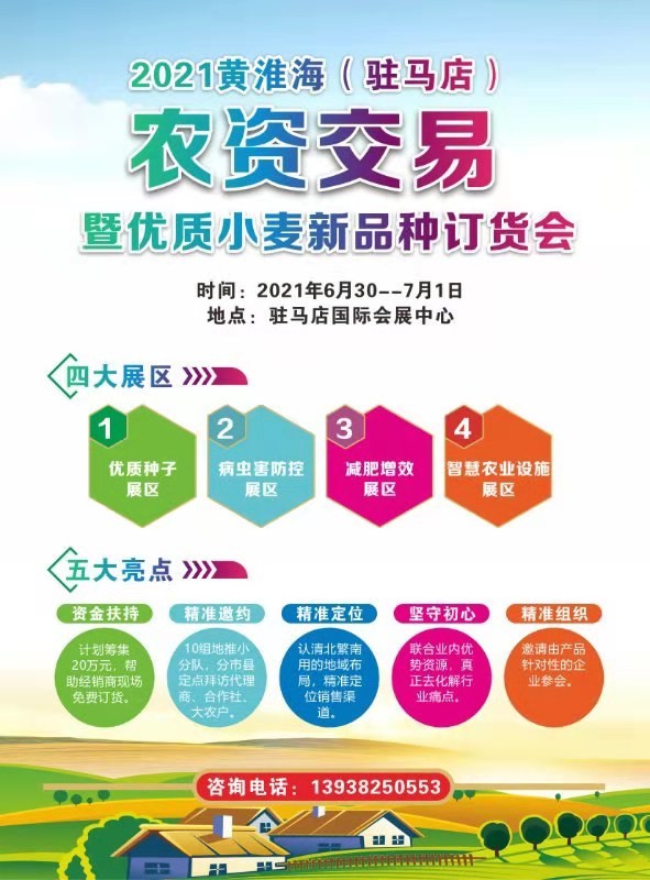 為促進我省小麥種子北繁南用,加快我省花生品種推廣、普及高效綠色防控成果,促進一二三產(chǎn)業(yè)融合發(fā)展,提升我省農(nóng)業(yè)品牌。2021黃淮海(駐馬店)農(nóng)資交易暨優(yōu)質(zhì)小麥品種展覽會、2021第二屆河南花生產(chǎn)業(yè)信息交流暨品牌農(nóng)資農(nóng)機展覽會將于6月29日到7月1日在駐馬店國際會展中心舉辦。